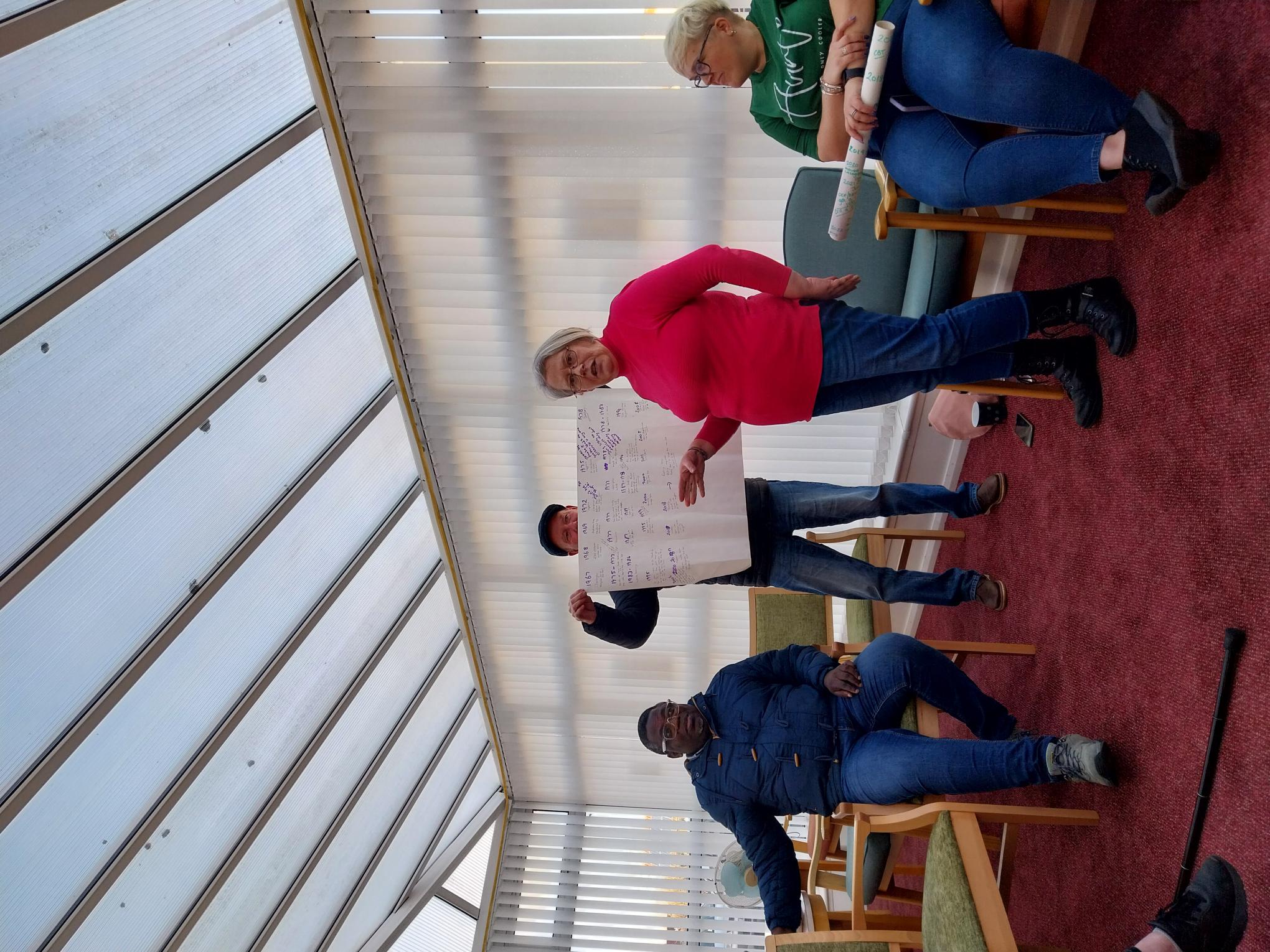 With an endless supply of flipchart paper and colourful pens, the commissioners have been completing timelines of their lives to help them organise their thoughts and map out their stories. Everybody has had a different approach to this, some chatted in small groups, some went off to a quiet space to work alone and others needed a little more 1:1 support. Two of the more confident members were keen to share their timelines with the group. This was an emotional process for all of us as we heard their truths of the care system, abusive relationships, abandonment, drug use, hopelessness… Although the stories were traumatic, both ended on a positive note with the individuals now being active members of their communities, working on building their confidence and self-worth and finally seeing a future. As ever, the group were very supportive of each other, giving rounds of applause, displays of empathy and words of positivity and hope.